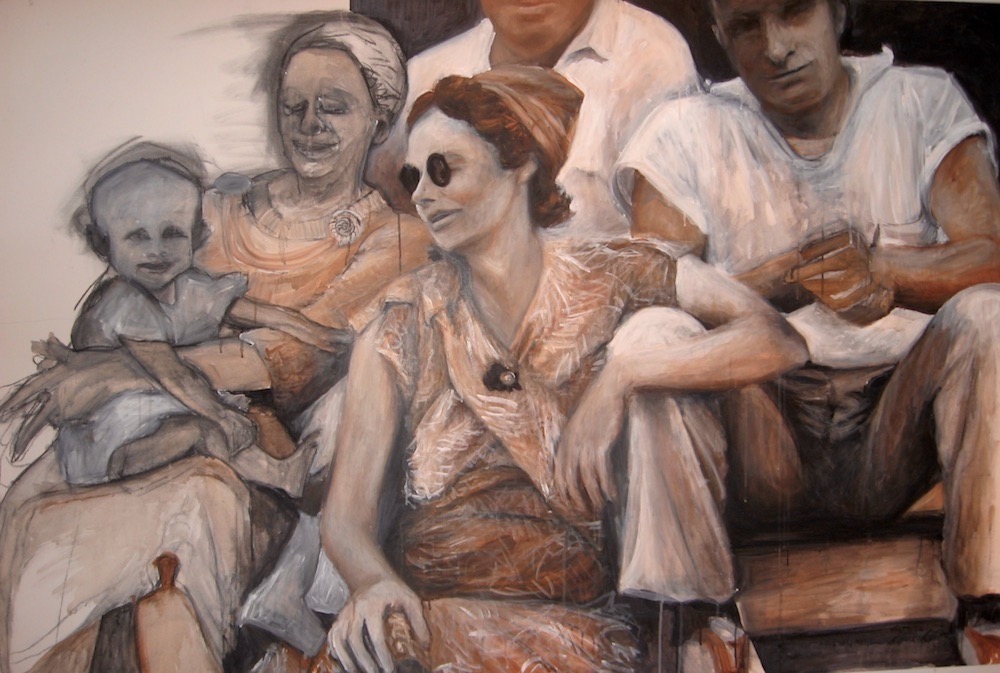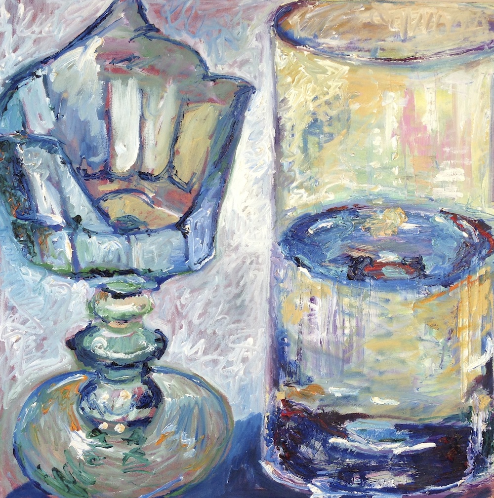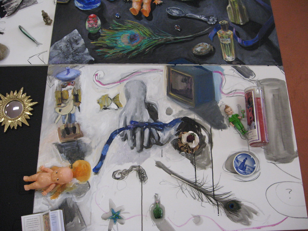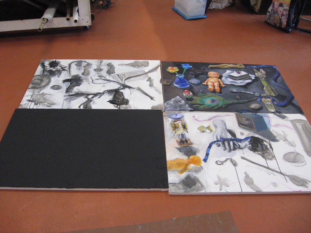This painting is a homage to the late great San Diego artist Manny Farber, but also a “Still – Life” representation/ portrait of myself and my existence … 4 panels all with objects that resonate and embody aspects of myself or my life — look from the top right, then top left, bottom left and bottom right. The painting becomes less realistically rendered and more sketchy as you progress in the order I have described… I occasionally asked if I’m going to “finish” these rudimentary areas. This painting is a self portrait and when I created it my life was different and so was my “storyline”…. the last panel is barely a sketch – with a question mark drawn with charcoal …. and so is my life still — All that I can offer is that I have one foot in the past and another in the future and I’m trying to balance in the present tense as best as I can!