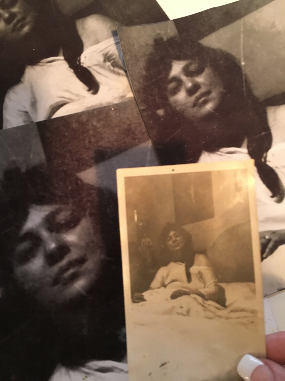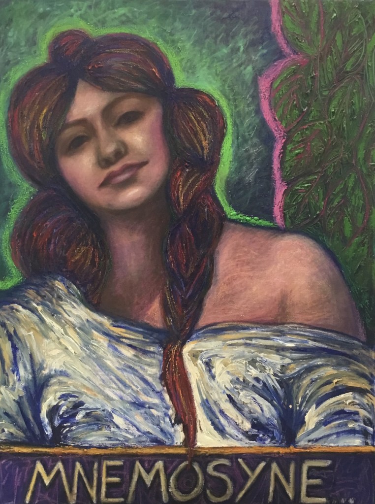 I created this painting based on an old photograph that I bought at a thrift store, in fact, I bought the entire family album for $2.00. It dated back to 1912 with really wonderful photographs. This woman went from being a new bride to a grandmother over the course of the pages. I admire her spunk and spirit, so clearly evident, she seems like she was a really wonderful gal. This photograph, in particular, really engaged my interest. It is so very intimate — of a woman sitting in bed, hair undone and shoulder exposed…. It is timeless and beautiful and sad. She is Mnemosyne the Greek goddess of memory.