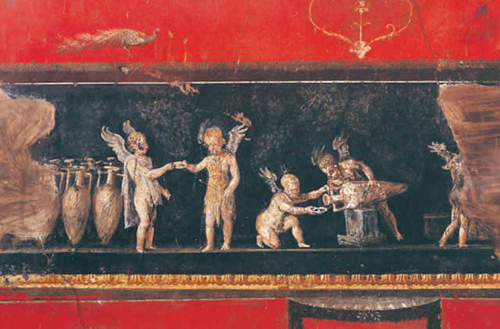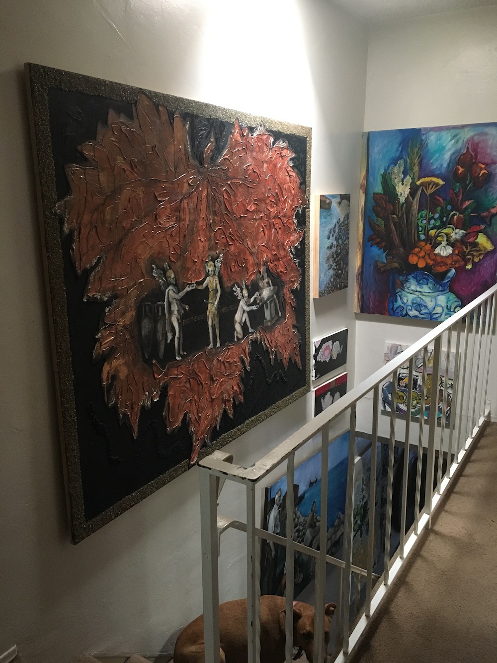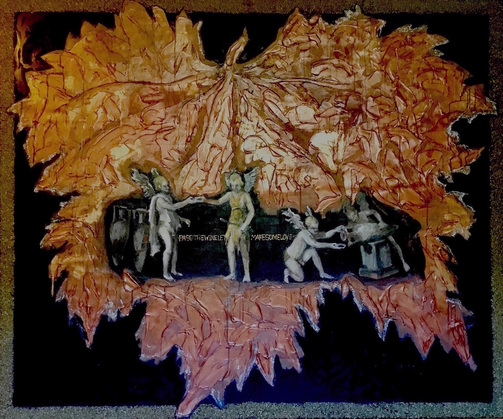 This is a bronze colored grape leaf with a copy of a fresco from the excavated ruins of Pompeii. Originally, it was a “tapestry” (acrylic on unstretched canvas) that I created for the purpose of beautification and decoration during an Elementary school’s Wine and Dine fundraiser, but it also was an experiment with impasto acrylic products. However, it had been rolled up in storage for many years, where it became damaged… textural impasto doesn’t like to be bent or extreme heat. Anyway, I cut the grape leaf with the Pompeii fresco out, glued it to a wooden substrate and repainted the background. It is entitled, “Pass the Wine, Lets Make Some Love” – This is about cherishing the moment, being truly happy, love, friendship, and counting your blessings because at any moment everything could change…